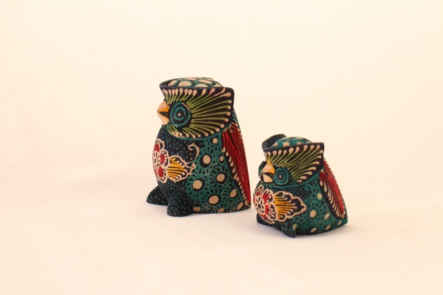 写真 左 ふくろうM ぽてっとした体形の可愛らしいふくろうの置物です。 木製で軽く、どこにでも馴染みます。 サイズ S:高さ4.5~5㎝/M:高さ6.5~7㎝ ※手作りのため、若干の個体差があります。 素材 木(センゴン) 生産国 インドネシア 生産者 APIKRI 伝統工芸職人たちの地位向上を目指すフェアトレード団体です。 詳しくはこちら→(AWEPウェブサイト)https://bit.ly/2wZlqbi