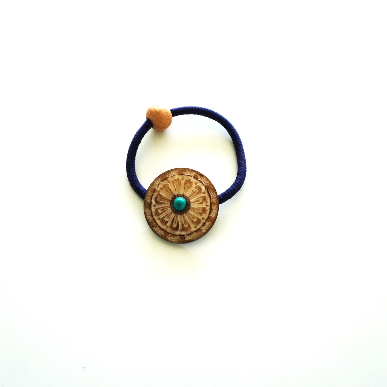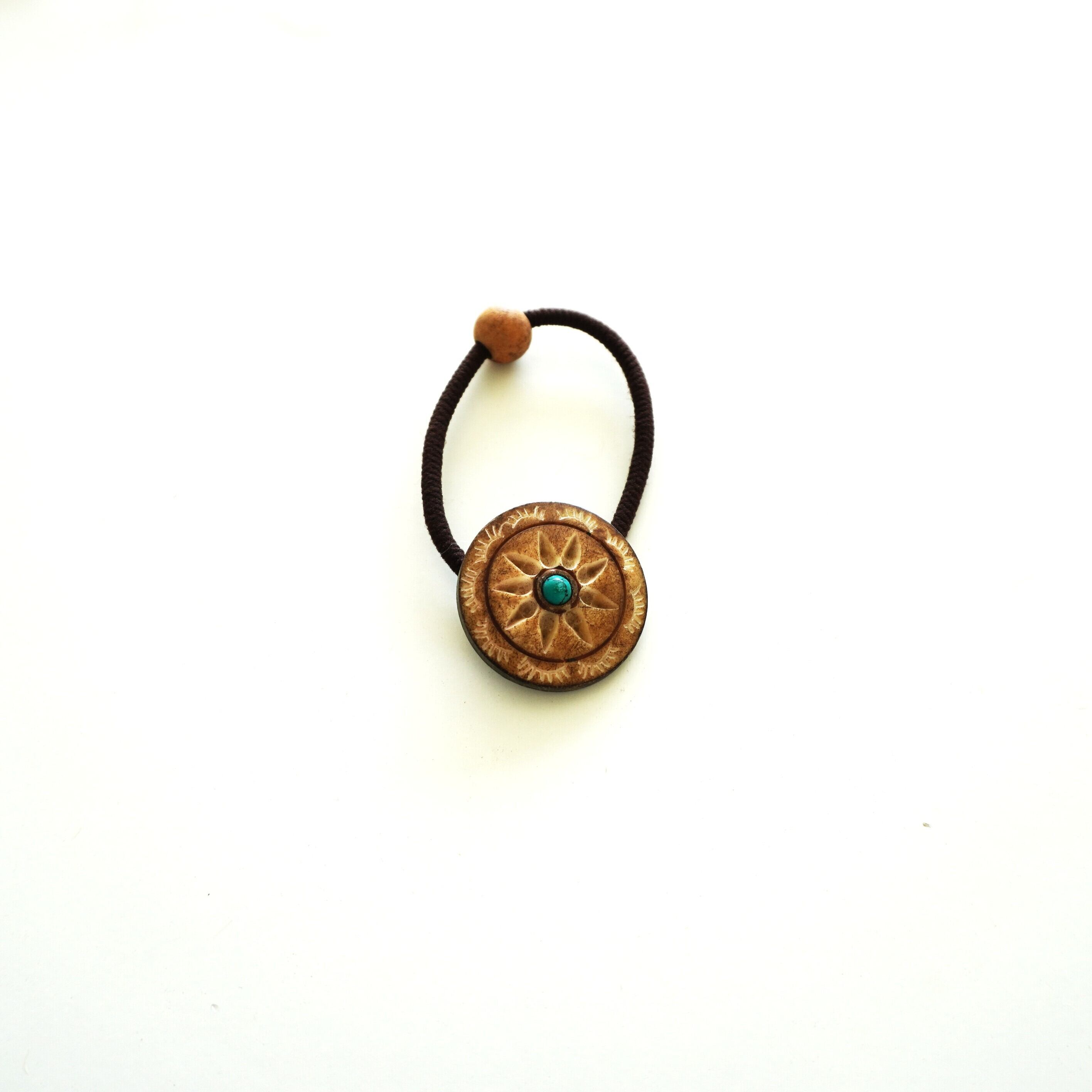 自然の恵みを感じる、捨てられる水牛の骨をリサイクルしたこのヘアゴムは、手彫りで作られた唯一無二のアイテムです。水牛の骨から生まれたボタンは、その質感と温かみを感じさせ、職人の繊細な手技によって、心を込めて彫り込まれた模様が特徴です。このヘアゴムを身につけることで、エコを意識しながらも、あなたのスタイルをより印象的に演出してくれるでしょう。